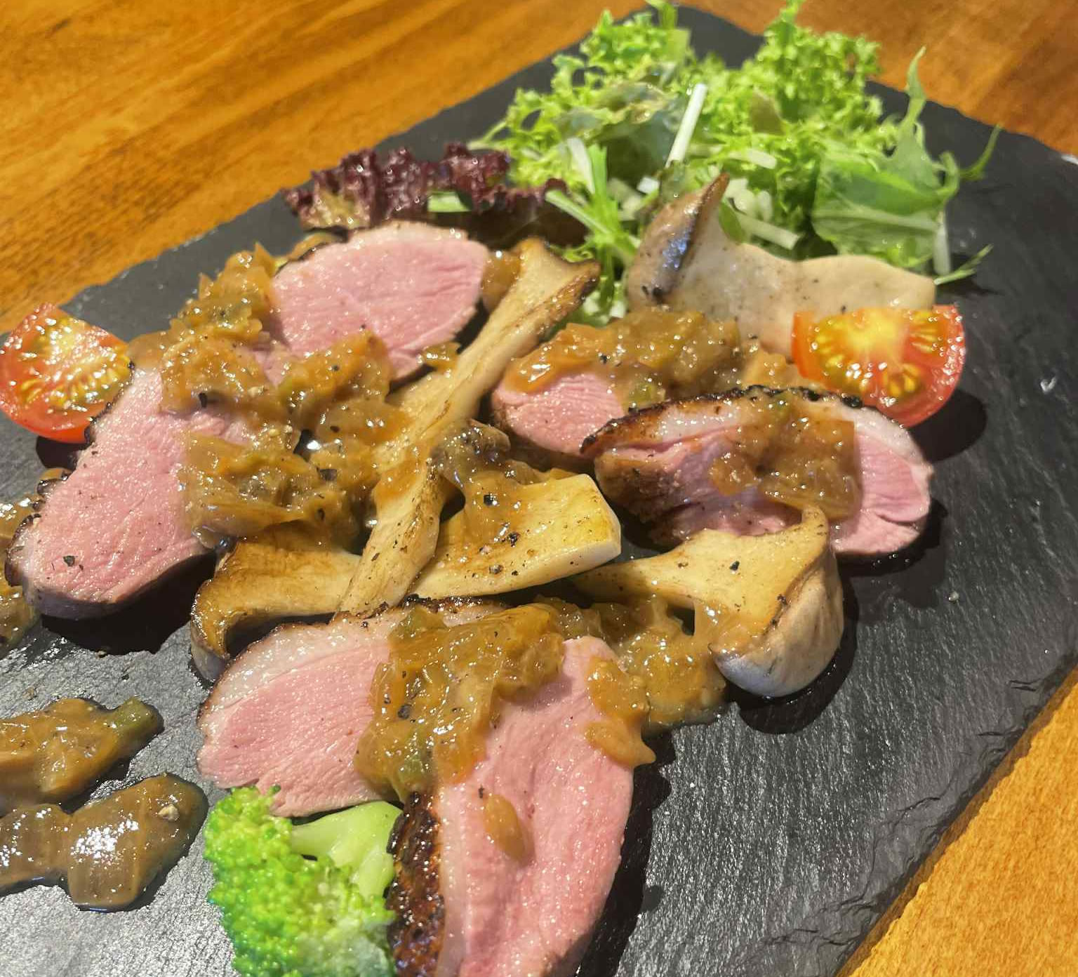 濃厚なシャンピニオンソースとジューシーな合鴨のマリアージュをお楽しみください☆